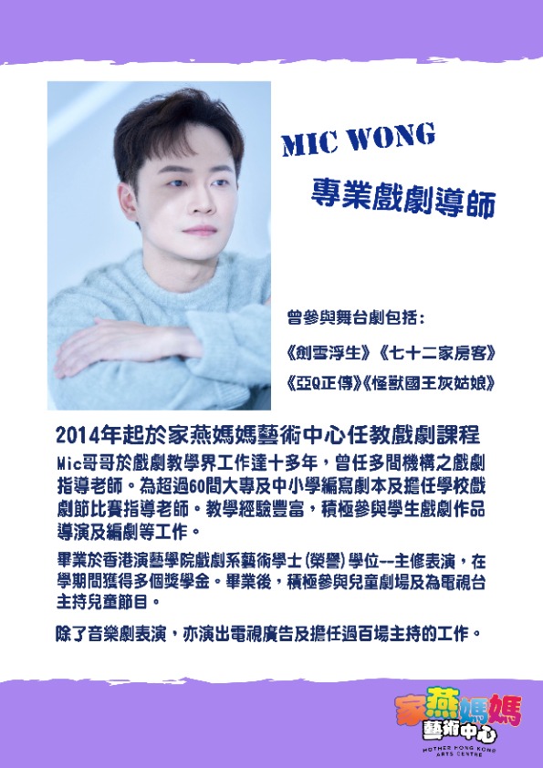 *曾任教多間學校機構戲劇班﹑配音班﹑舞蹈班及戲偶班